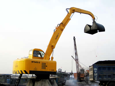 WYS42C-G型電動液壓固定式疊臂抓料機的回轉、卷揚、變幅及抓斗開閉作業等全部采用電動液壓驅動,先導控制。具有作業平穩、各動作可無級調速;同等作業效率下可比內燃機驅動節省60%能耗;司機室安裝冷暖兩用空調、多向調節座椅,作業環境舒適;配裝不同的液壓抓斗后均有自重小、抓取力大,對沙石、煤等散裝原料進行抓取作業。